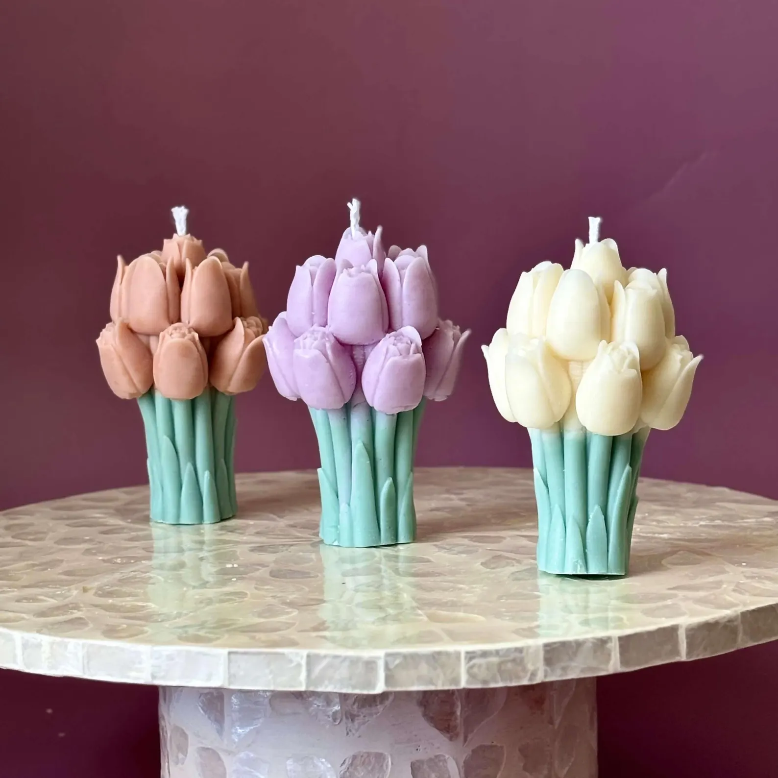 Hand-poured with creamy soy wax and shaped like a blooming tulip bouquet, it’s made to stop someone in their tracks – not just to light, but to admire.